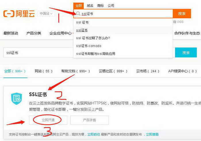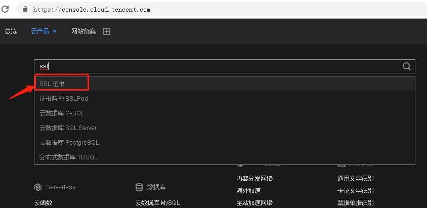 2. 搜索產品“SSL 證書” https://console.cloud.tencent.com/ssl/