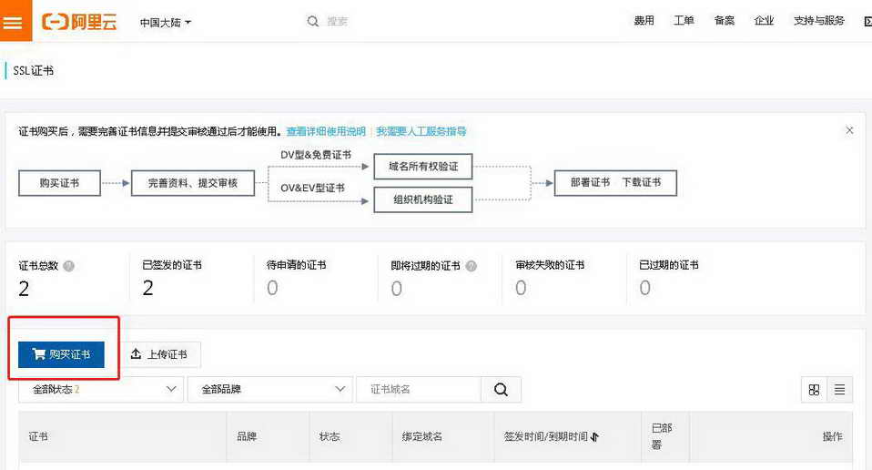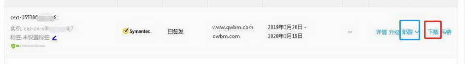 6. 解析好之后就可以下載對應的證書(如果你不是用阿里云的服務器就點擊下載(下載的時候選擇對應的版本類型,如果是IIS就選擇IIS),如果你使用的是阿里云的云服務器,可以點擊部署就行了,就更方便了。)