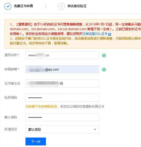 4. 提交要申請的證書信息(一定要填寫域名證密碼---這個在后期時候特別有用)