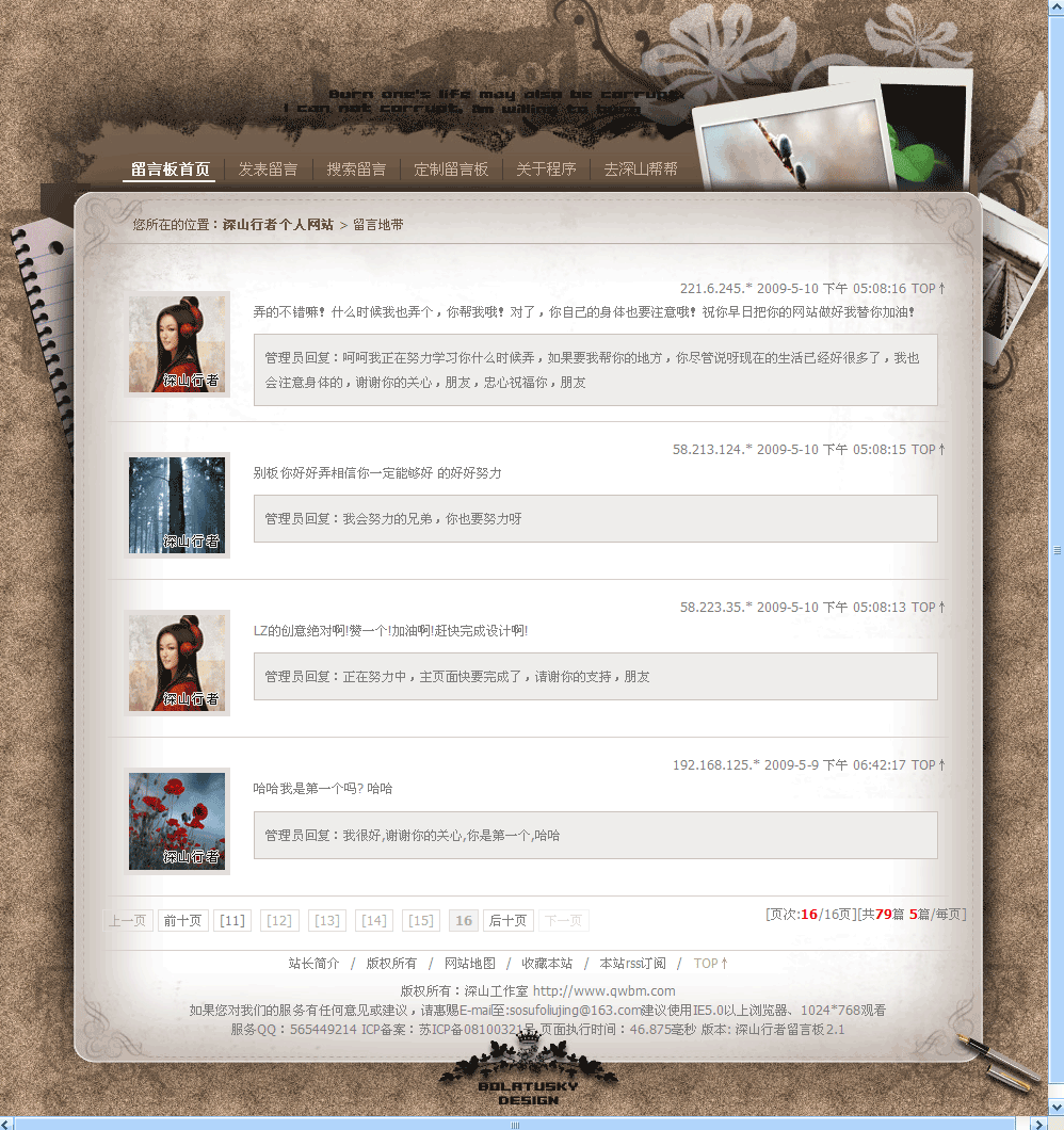 如果您是一位美工高手,為本站的留言簿制作了外殼,希望我們為您改制留言板,可以聯系我們.